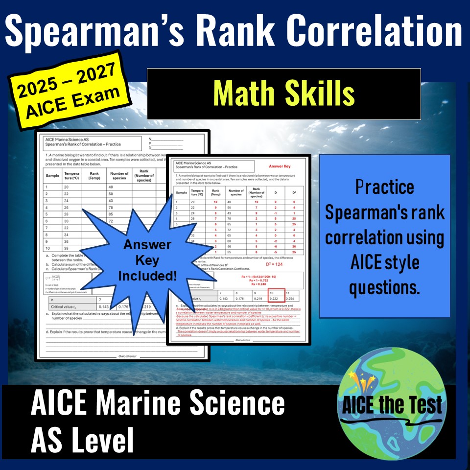 This lesson on Spearman’s Rank Correlation is a vital addition to the marine science curriculum. It equips students with the tools to analyze and interpret complex data, enhancing their understanding of marine ecosystems. By engaging in both collaborative and individual activities, students develop critical thinking and problem-solving skills that are essential for the AICE Marine Science Exam. Through this lesson, we aim to inspire and prepare students to tackle the challenges of the AICE examination.